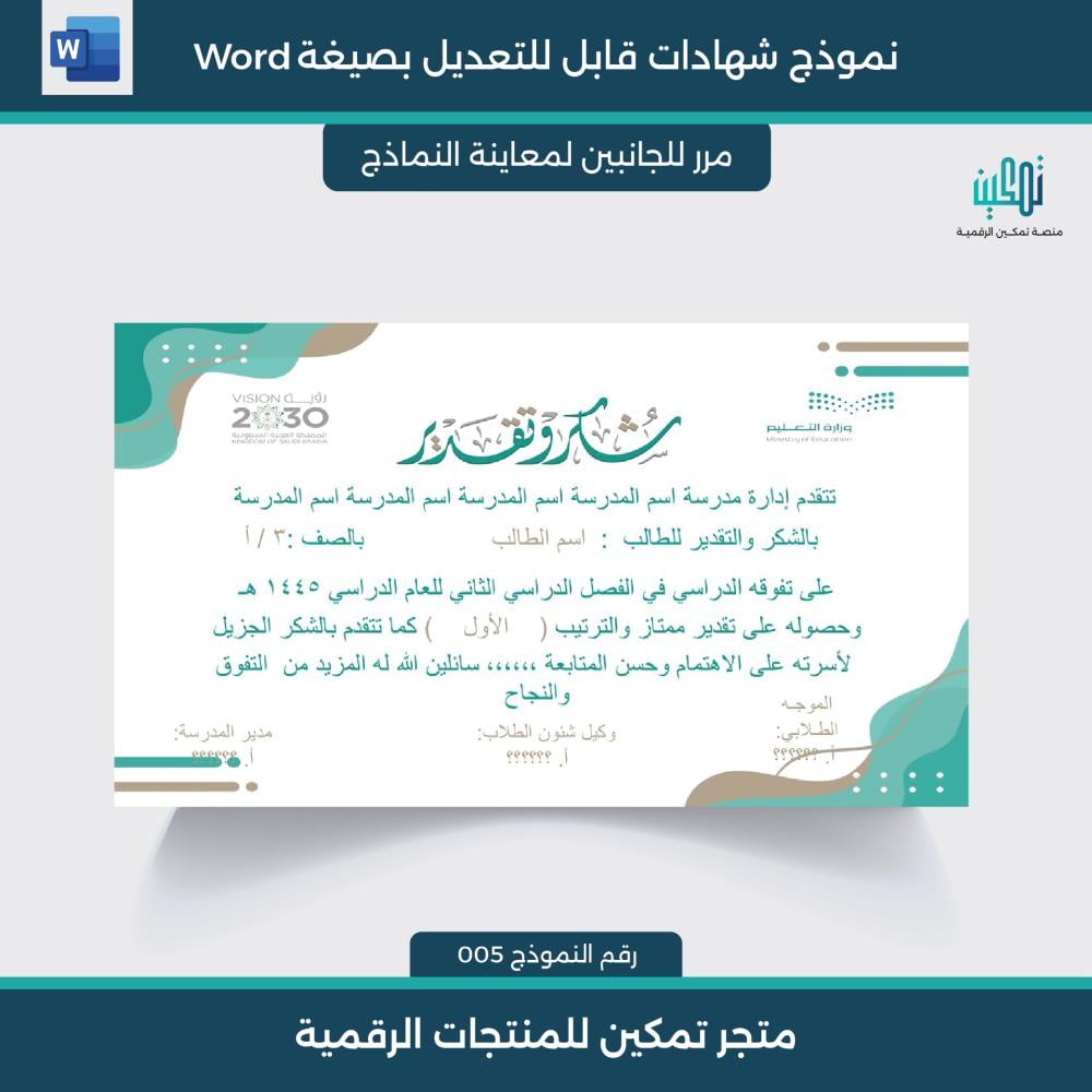 شهادات شكر شكر وتقدير جاهزة وقابلة للتعديل word نموذج 005